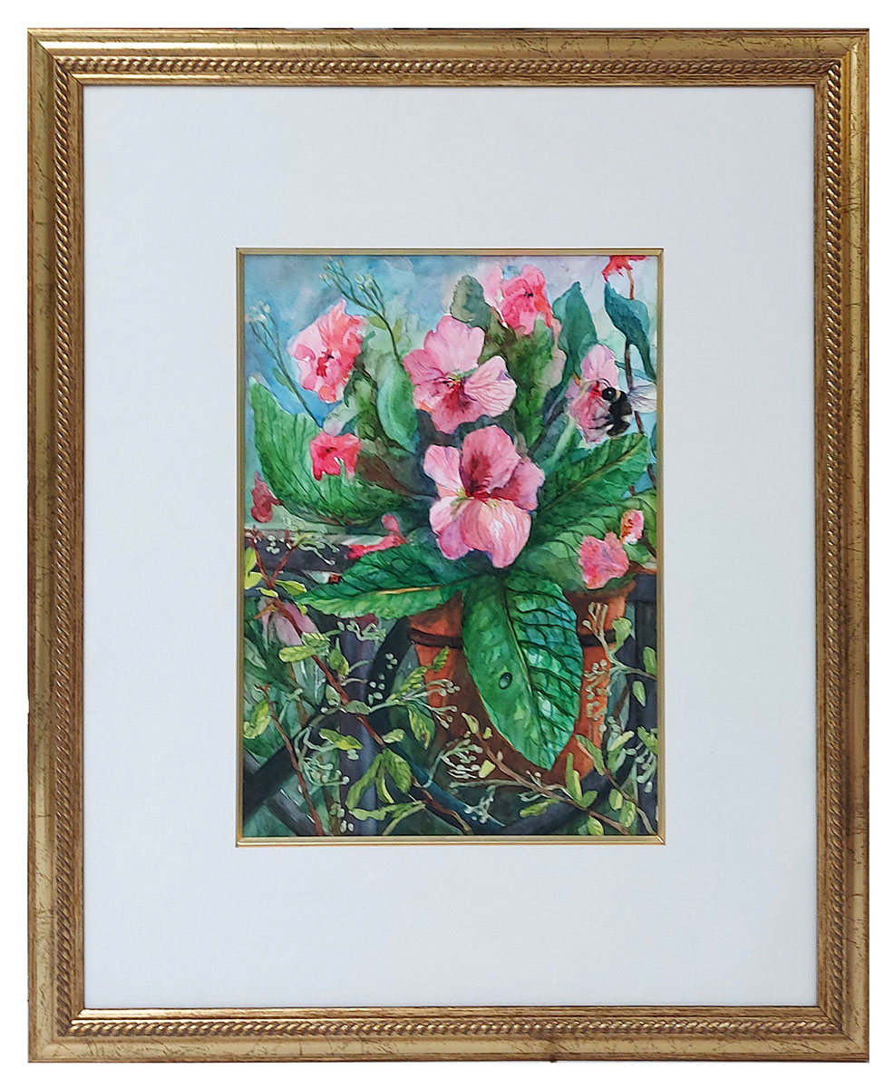 Aquarel, Bloemen met lieveheersbeestje en hommel