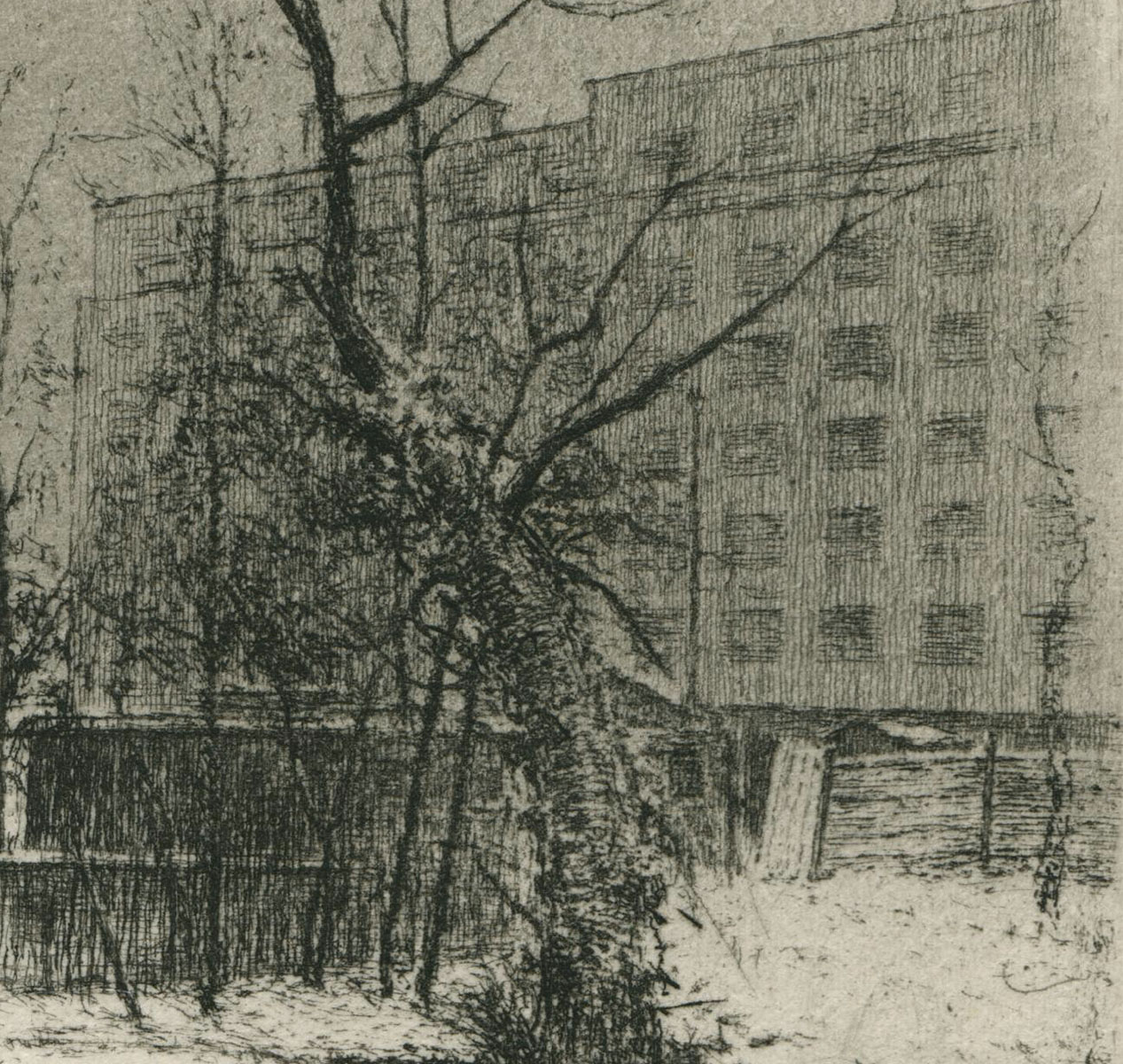 Winter, boom en beekje aan het appartementsblok