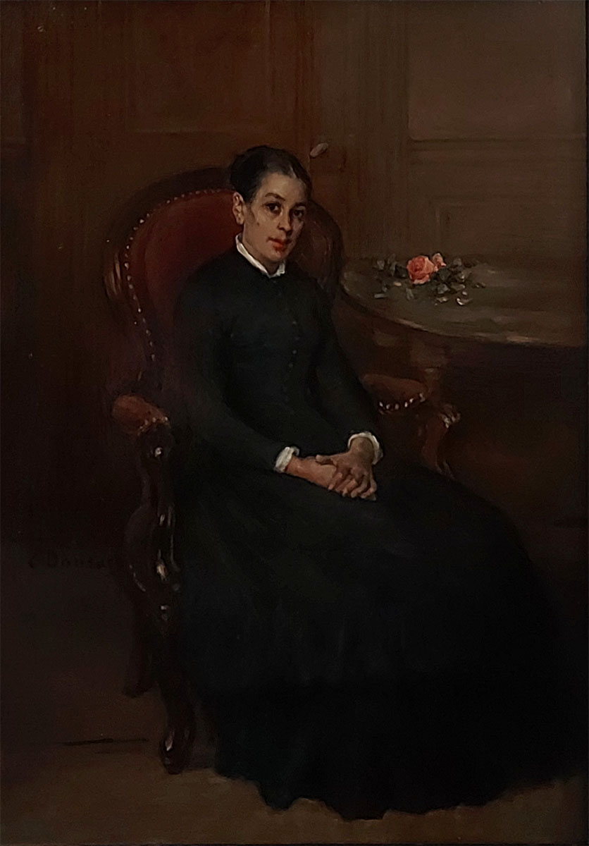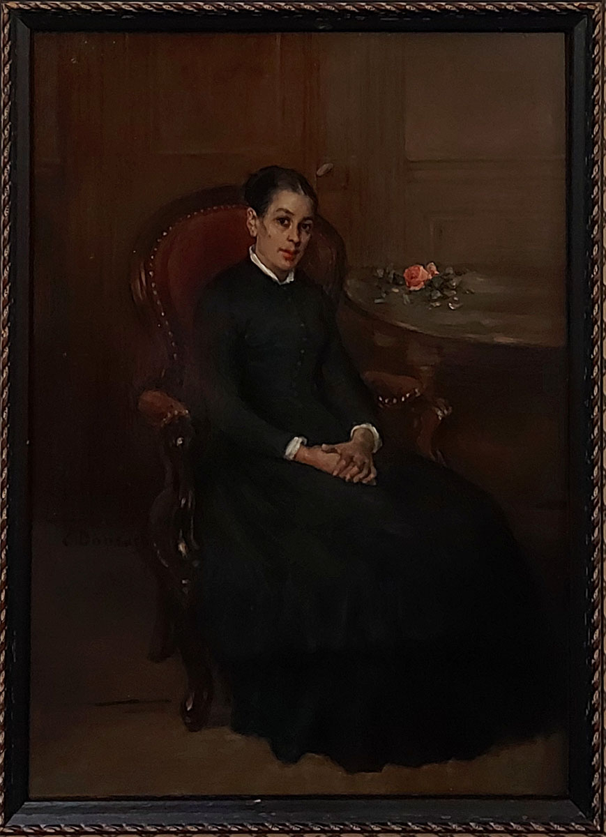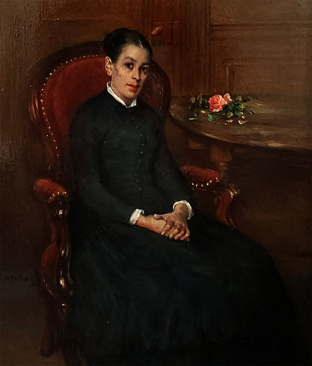 Voorname dame op stoel met roosje op tafel (voor 1900)