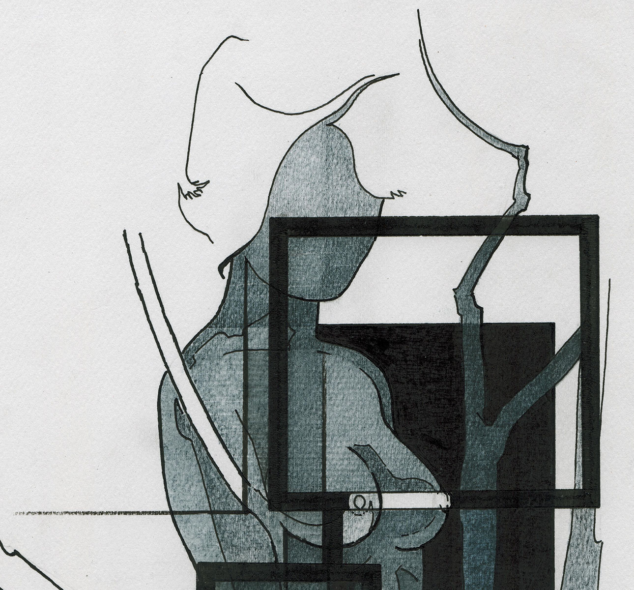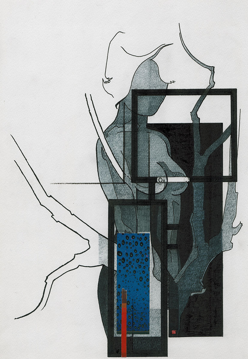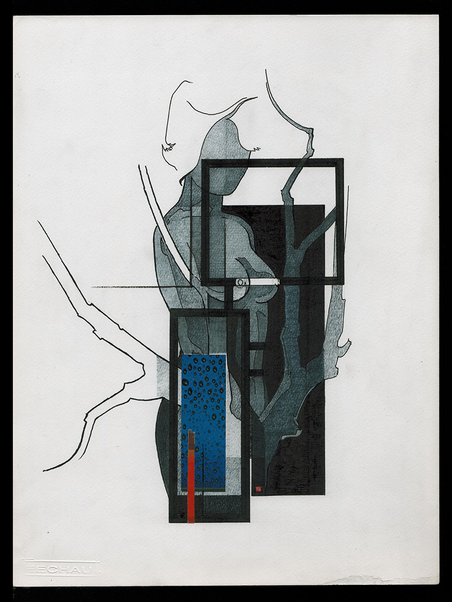 Tekening gemengde techniek, naakte dame aan boom 20 12 1983