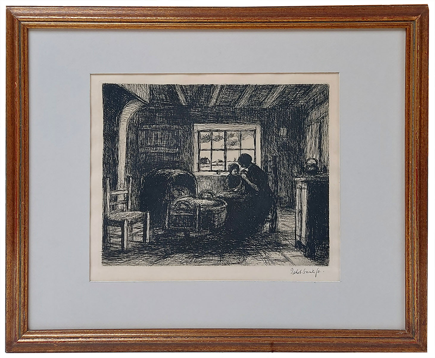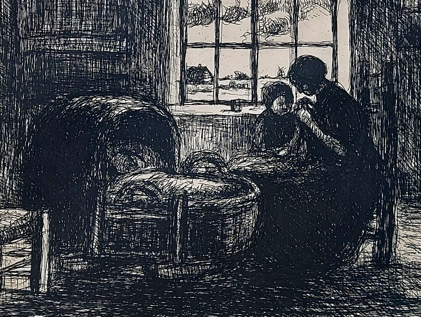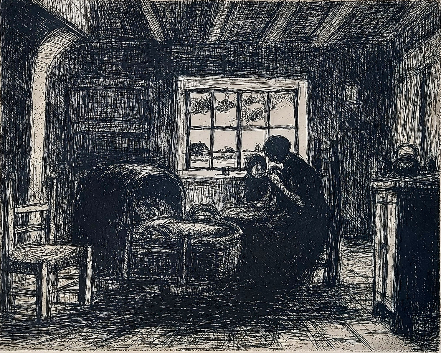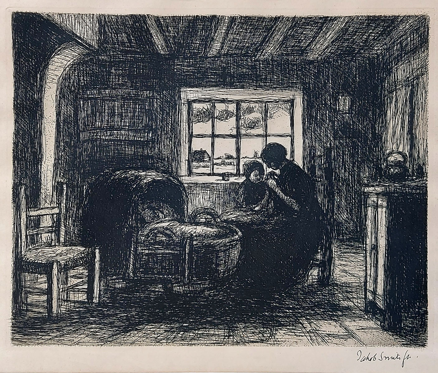 Cette eau-forte de Jakob Smits représente une scène domestique intime où une mère veille tendrement près du berceau de son enfant. L’intérieur sobre est éclairé par une fenêtre laissant entrevoir le paysage campinois. Par des traits simples et puissants et de forts contrastes, Smits traduit le calme, la simplicité et la spiritualité de la vie rurale. L’œuvre reflète son attachement à la Campine et son désir d’élever la vie quotidienne dans une atmosphère poétique et spirituelle.